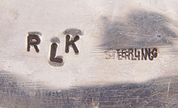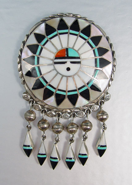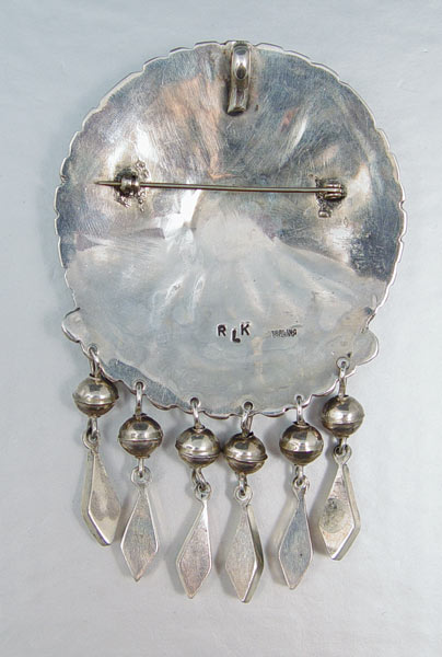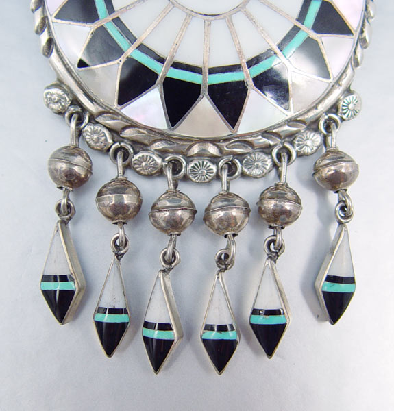 ZUNI INLAID PIN/PENDANT SIGNED RLK: Abalone, onyx, turquoise and coral set in sterling, pin and pendant findings, signed verso and marked Sterling, approx. 4 1/4'' x 2 5/8'' overall.