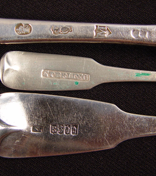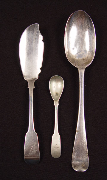 3 PIECE 18TH CENTURY ESTATE IRISH STERLING: To include 1) 1760 Dublin hallmarked table spoon, engraved boar & sword decoration. Illegible makers hallmark. Note condition. 8 3/8''. 2) 1789 Dublin hallmark, makers initials IS (attrib. John Stoyte) master butter with engraved Irish flag on handle, 7 3/8''. 3) Demitasse spoon with engraved Irish flag, similar to master butter, simply marked Sterling, no other hallmarks, 4 1/4''. Approx. 3.8 troy oz.