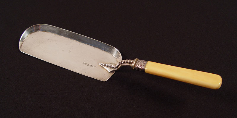 ROBERTS & BELK ENGLISH STERLING CRUMBER: Hallmarked 1898 Sheffield and maker Roberts & Belk. Ivory appearance handle. no brush. Measures 12 3/4'' long.