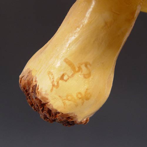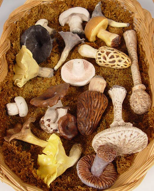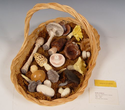SCHOVE, BABS ( American 1915-2007) ''ONE MAN'S MUSHROOM IS ANOTHER MAN'S POISON'': A basket filled with 17 examples of mushrooms, porcelain and acrylic. Artist signed. Ca. 1995-96. 1 8 1/2'' long.