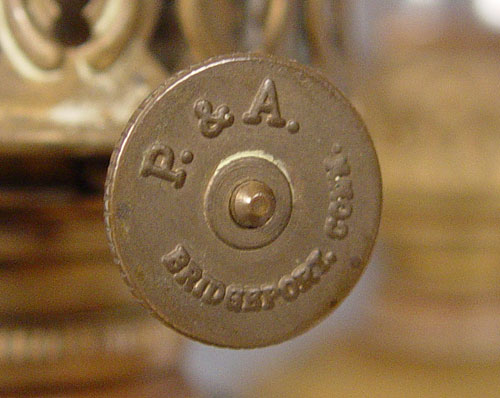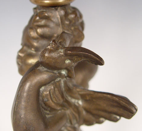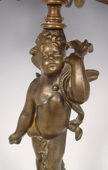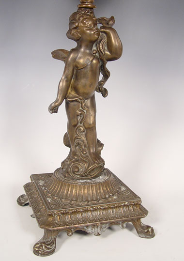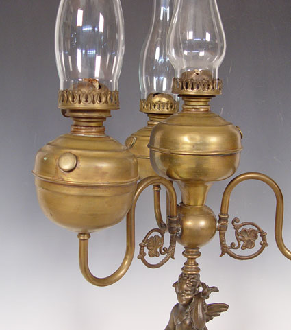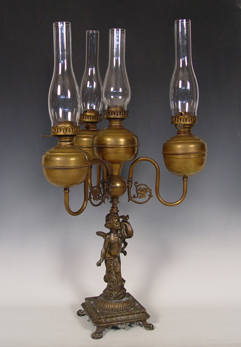 PLUME & ATWOOD FOUR FONT FIGURAL OIL LAMP: Cherub figure supporting 4 brass fonts, each with the thumbwheel marked P&A. 27''h. excluding the glass chimneys, 20 wide.