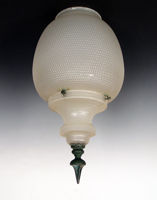 LIGHT GLOBE: Salvaged from a Chicago building. Metal spire finial, glass comes apart into 2 sections. Measures 26 1/2'' h. x 15'' dia. 8'' fitter rim.