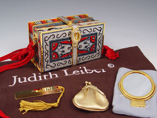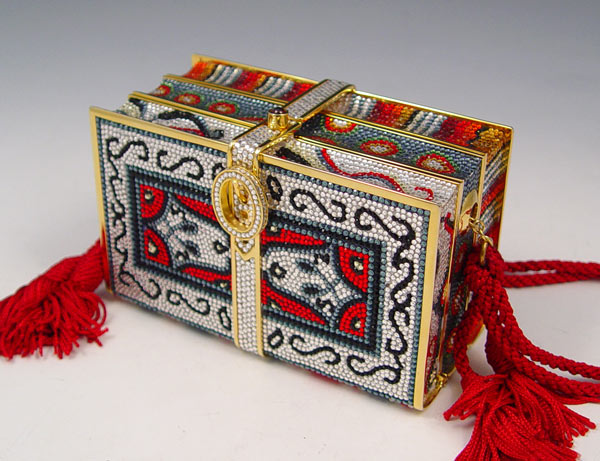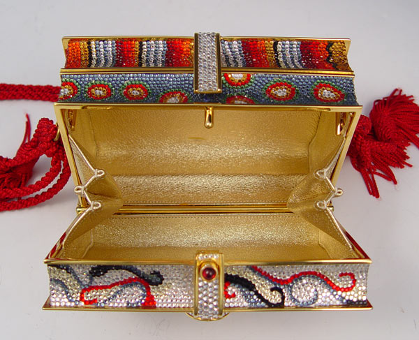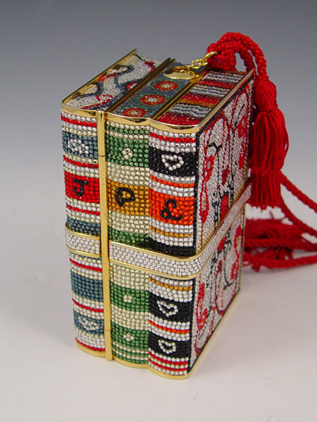 JUDITH LEIBER CRYSTAL BOOKS EVENING BAG: Colorful crystals in the form of three stacked books. Includes the red cord strap, mirror, change purse and comb. 5 1/2'' x 2 1/2''. Sold with felt Judith Leiber storage bag.