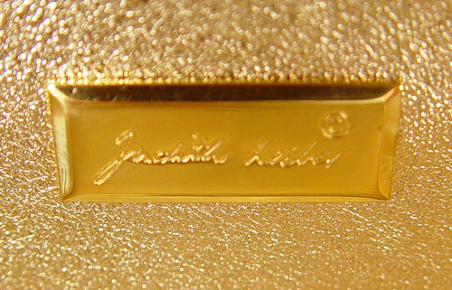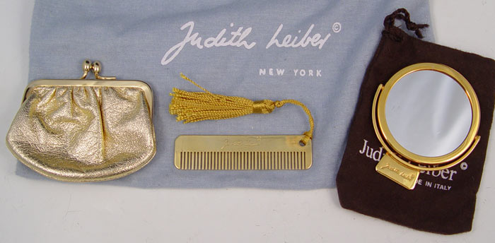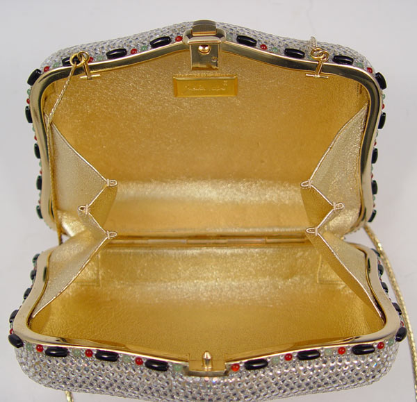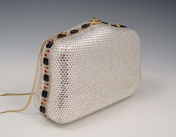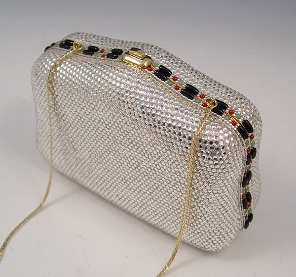JUDITH LEIBER CRYSTAL PURSE: Clear crystals with onyx, garnet and jade clasp. Includes the chain strap (note kinks), mirror, change purse and comb. 7 1/2'' long. Sold with the Judith Leiber felt storage bag.
