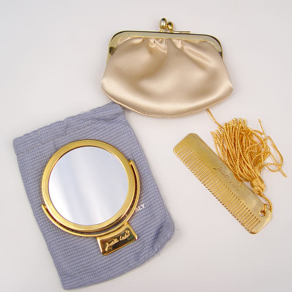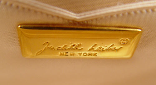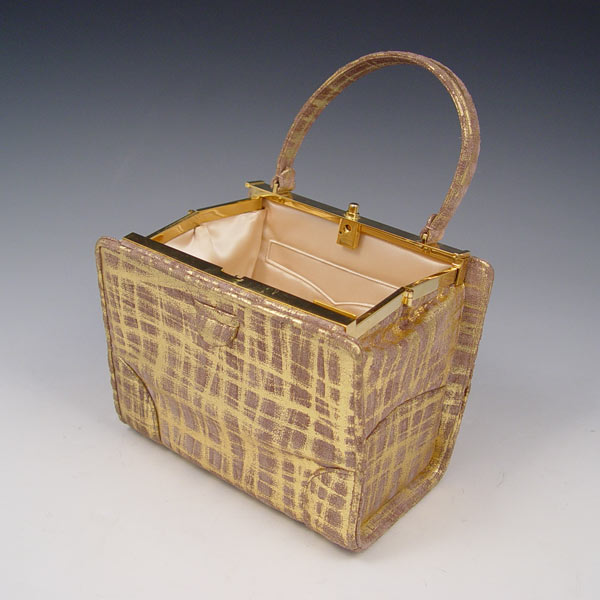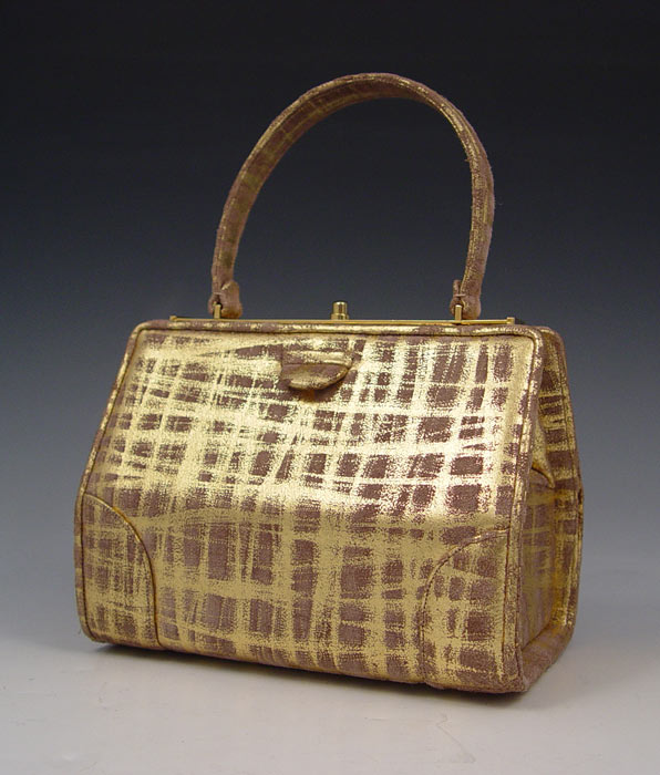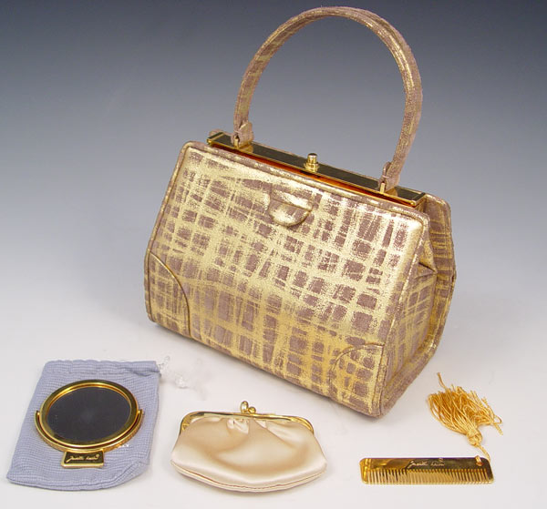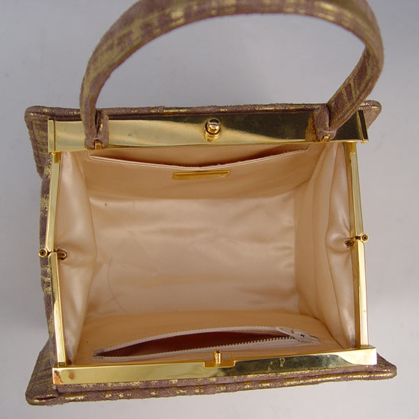 JUDITH LEIBER PAINTED SUEDE HANDBAG: Gold paint on brown suede. Includes the mirror, change purse and comb. 5'' x 7'' x 4 1/2''.