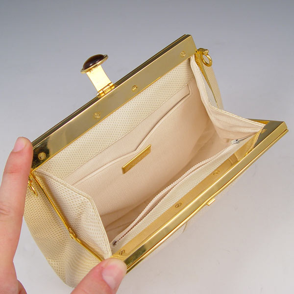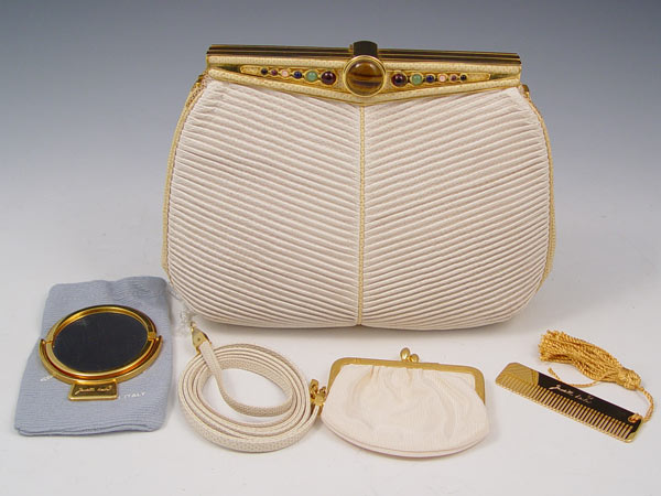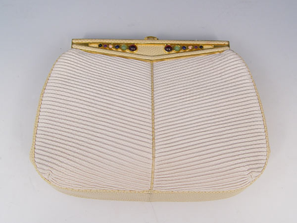 JUDITH LEIBER PLEATED SNAKE SKIN HANDBAG: White snake skin with semi precious stone clasp. The largest stone is a tiger eye, the others are lapis, jade, rose quartz, and amethyst. Includes the strap, mirror, change purse and comb. 6'' x 8''.