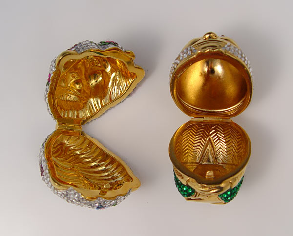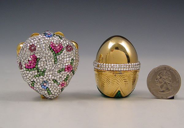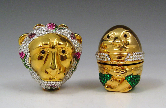 2 JUDITH LEIBER CRYSTAL PILL BOXES: 1) Humpty Dumpty, 2''. 2) Lion, 2''. Each with hinged lid and crystal.