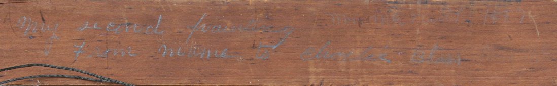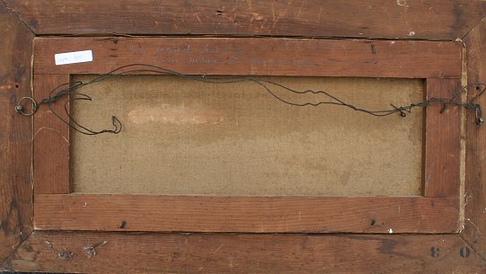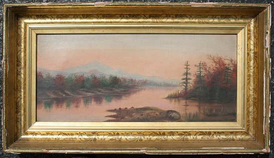 AMERICAN SCHOOL RIVER SCENE OIL/C: Measures 9 1/2'' x 20'', signed verso Mamie McDuffie, ''My Second Painting'', dated 1889, frame with wear, 13 1/2'' x 24 1/4''.