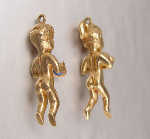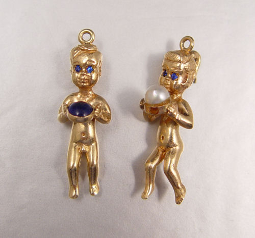 14K BOY & GIRL FIGURAL CHARMS: 14K yellow gold boy and girl charms. The boy holds a 5.00 mm round cabochon cut sapphire. The girl holds a 5.00 mm cultured pearl. Weight: 17.0 grams. Length: 1 1/2''.