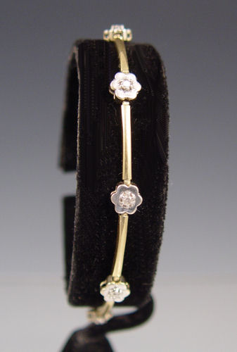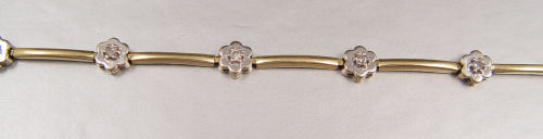 14K DIAMOND FLOWER BRACELET: 14K yellow with white gold bracelet contains 9 round full cut diamonds. Weight: .25 Ct. Approx. Rated I1 in clarity and I-J in color. The diamonds are prong set. Weight: 6.1 grams. Length: 7''