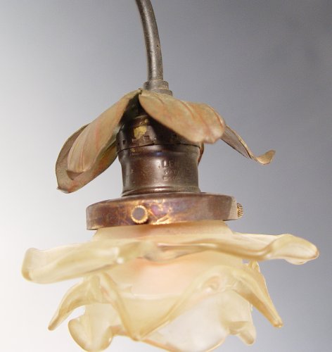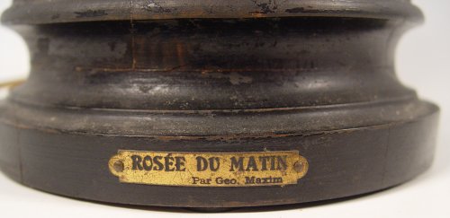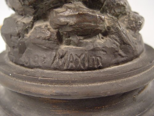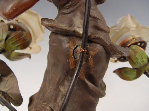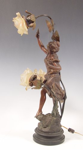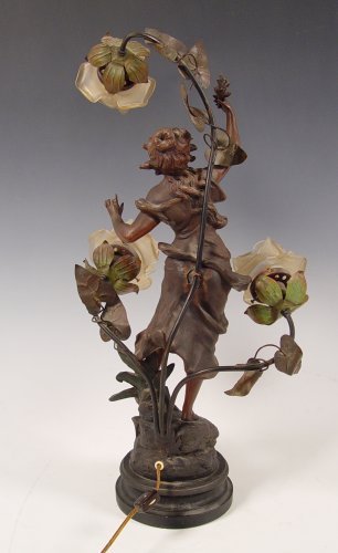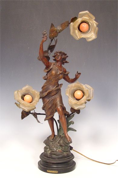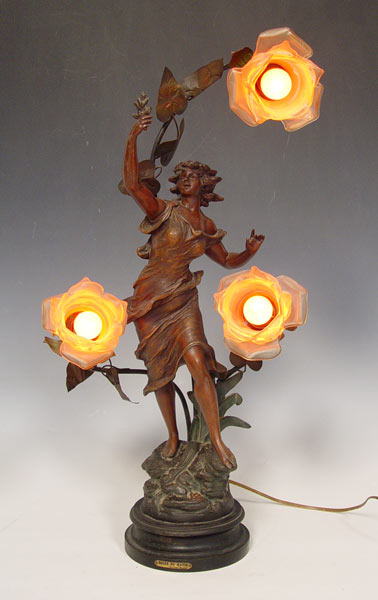 GEORGE MAXIM NOUVEAU FIGURAL MAIDEN SPELTER LAMP: 26''h x 14'' x 11 1/2''. 7'' base dia.