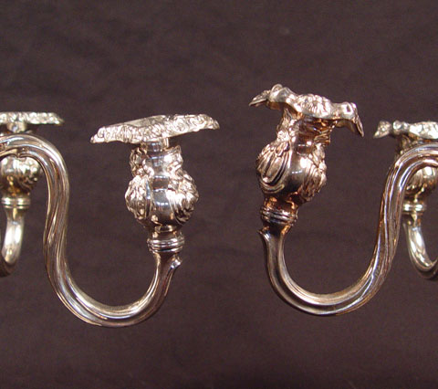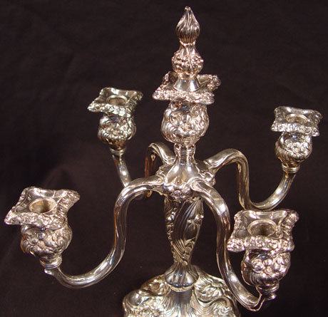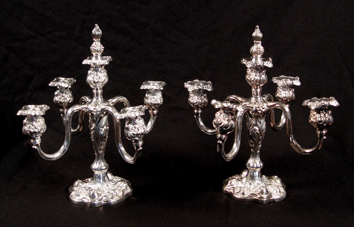PAIR 5 LIGHT APOLLO SILVERPLATE CANDELABRA: Repousse floral and garland design. 5 light with finial insert for center light. Apollo Silver Co. Measure 14 1/4'' h. overall x 14'' dia.