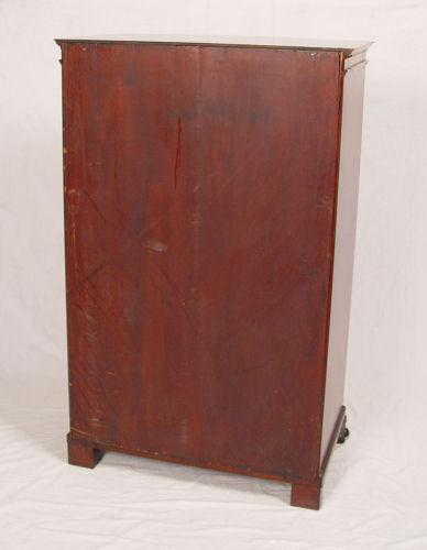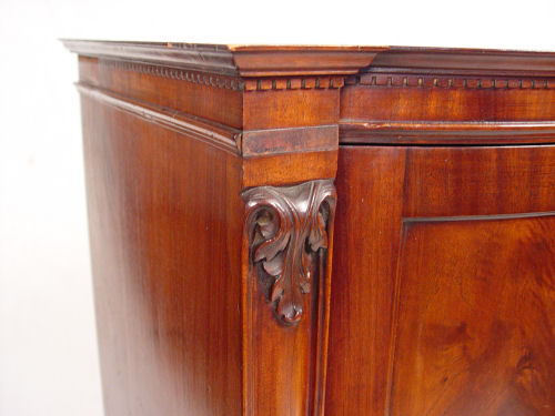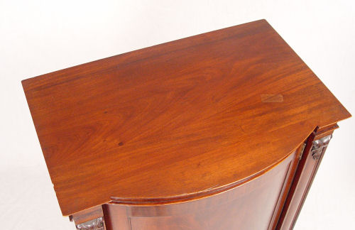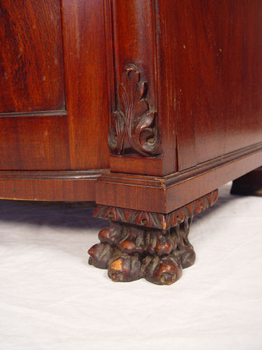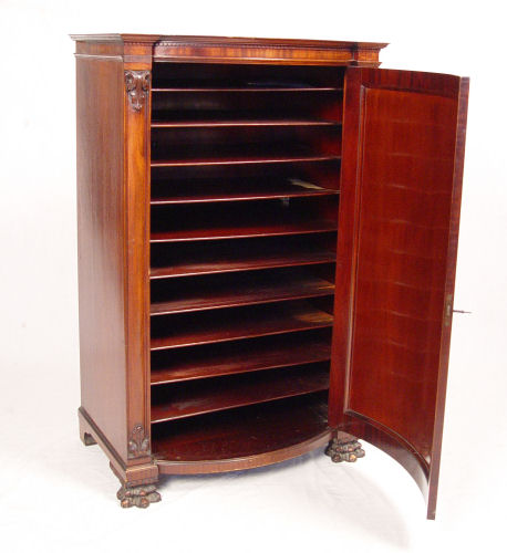VICTORIAN ERA MAHOGANY BOW FRONT MUSIC CABINET: Bowed single door locks with key. Sitting on carved lions paw feet, dentil molding. Interior with shelves. 44 1/2'' tall x 28'' x 19''.