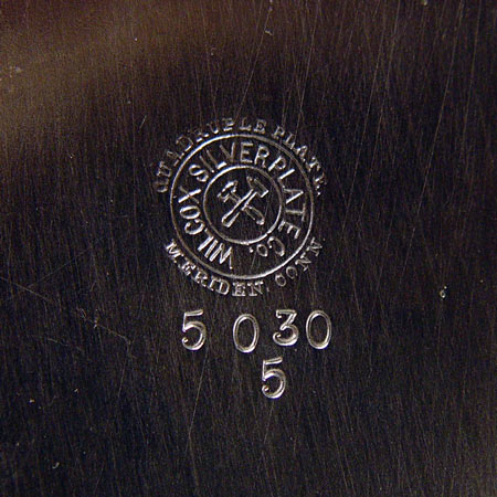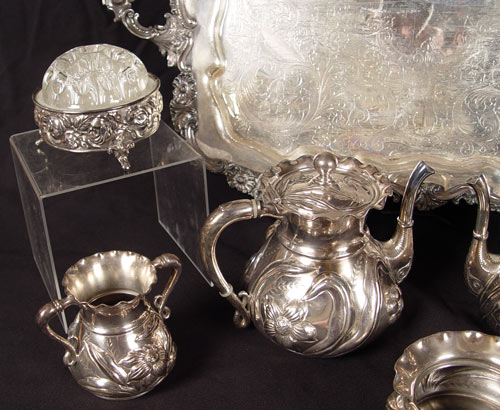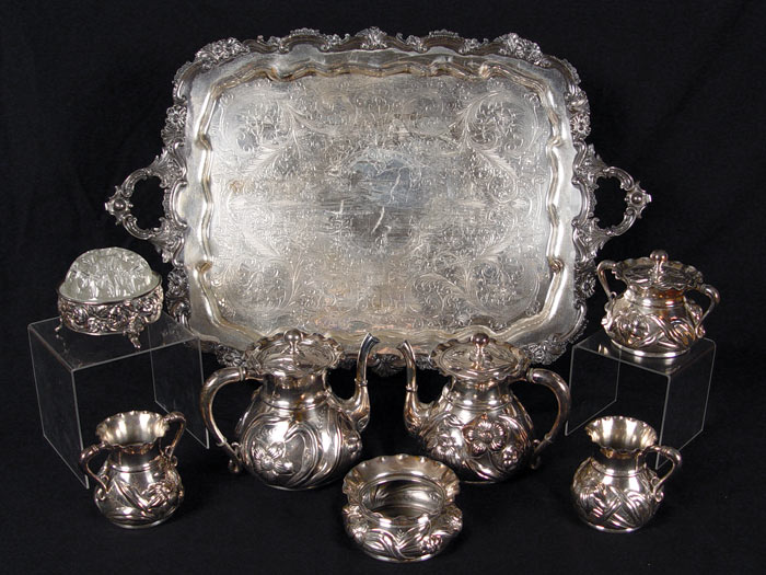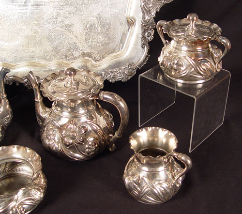 WILCOX SILVERPLATE COFFEE & TEA SERVICE: Repousse floral design to include 1) Coffee pot with hinged lid, 7'' h. x 8 3/4''. 2) Tea pot with hinged lid, 6 3/4'' h. x 8 1/2''. 3) Covered sugar double handle, 4 3/4'' h. x 6 1/2''. 4) Double handle vase, 3 1/4'' h. x 5 1/2''. 5) Open creamer, 3 1/4'' h. x 4 1/2''. 6) Waste bowl, 2 1/2'' h. x 5''. Set also comes with De Uberti footed flower frog with glass insert, 4'' h. x 4 1/4'' and L.B.S. Co. 2 handled tray, engraved, 27 3/4'' x 18''.