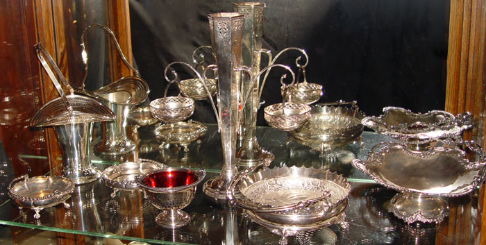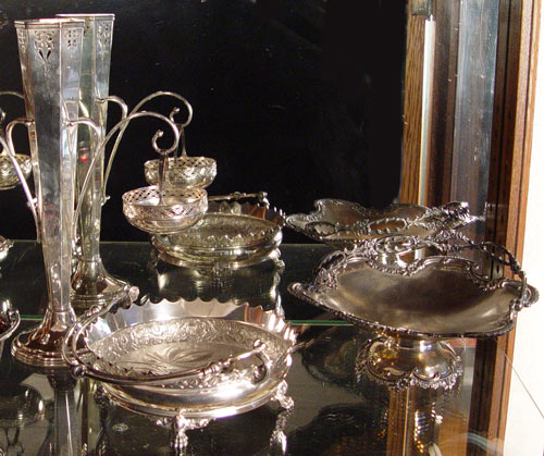 COLLECTION OF 7 SILVERPLATE BASKETS: To include 1) Meriden basket with articulated handle, 4'' high x 10 3/4'' dia, note loss of plate. 2) Sheffield basket with pierced rim, articulated handle 7 1/4'' high x 8'' x 7''. 3) Wilcox basket on 4 ball & claw feet, articulated handle, 2'' x 5 1/2'' dia. 4) Similar Wilcox basket, 2'' x 5 1/2'' dia. 5) Pairpoint vase with baskets 15 1/4'' high x 11 1/4'' x 4 3/4''. Note spotting, plate loss. 6) Wilcox basket with pierced design, cranberry glass insert, articulated handle. 3 1/2'' x 5'' dia. 7) Wilcox grape leaf design cake basket on 4 paw feet. 3'' x 8 5/8'' dia. Note handles not included in measurements.