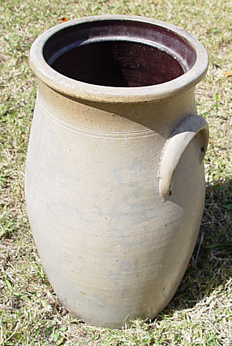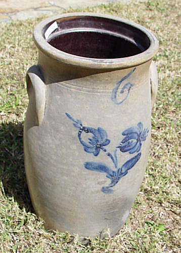 ANTIQUE COBALT DECORATED STONEWARE CROCK: Double flower decoration. 19'' tall, 11'' wide