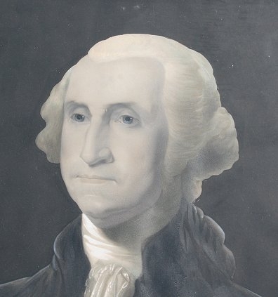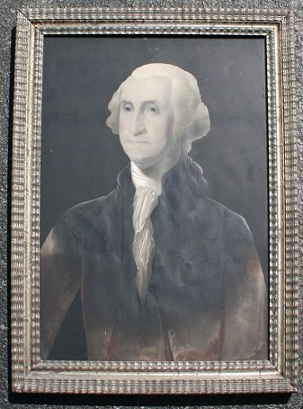 ENHANCED 19TH C PRINT PORTRAIT OF GEORGE WASHINGTON: Sight size 28 1/2'' x 20 1/2'', carved and silver gilt frame with minor wear, 33 1/2'' x 25 1/2''.