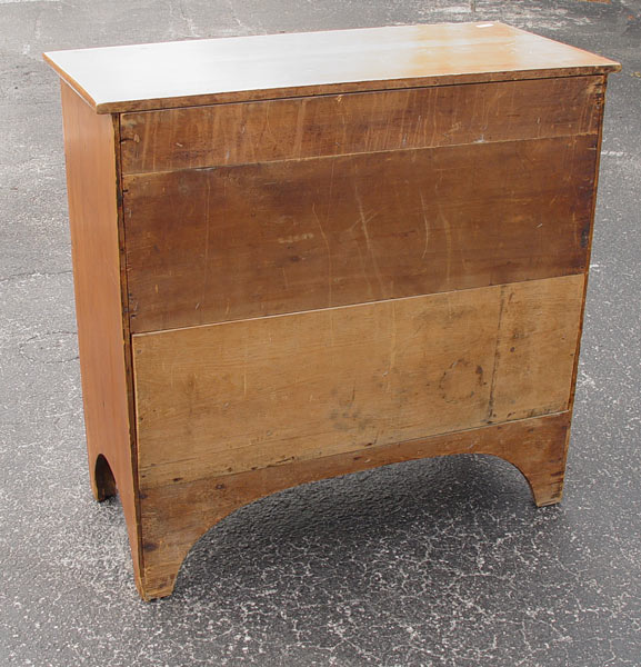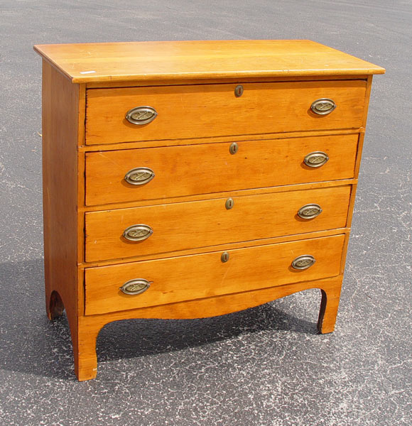 AMERICAN COUNTRY EARLY 19TH C FEDERAL STYLE 4 DRAWER CHEST: Extra high cut base, original bale pulls, decorative escutcheons. Old refinished condition. Measures 39'' h. x 40 1/2'' x 19''.