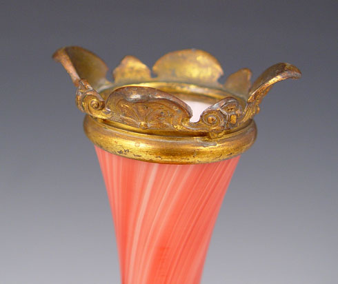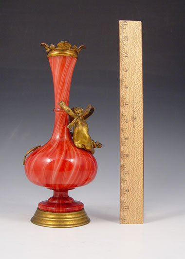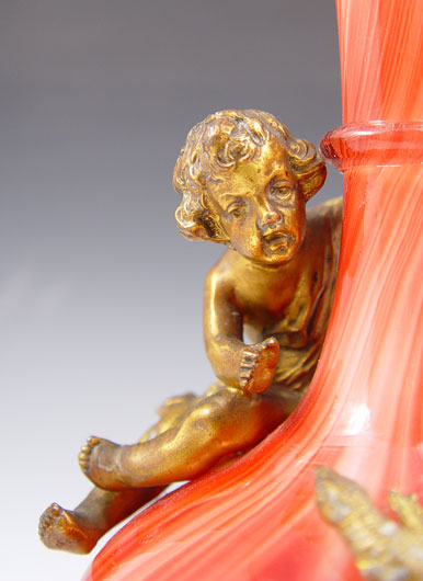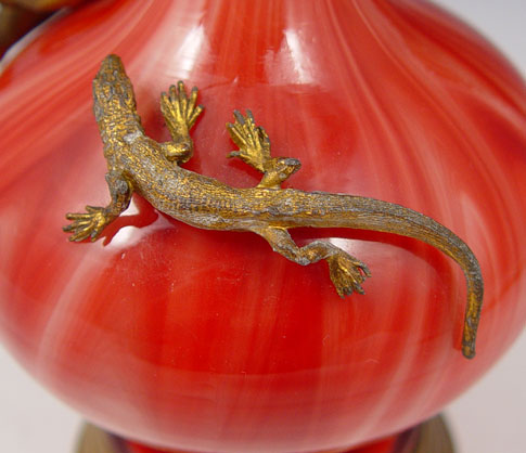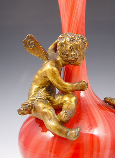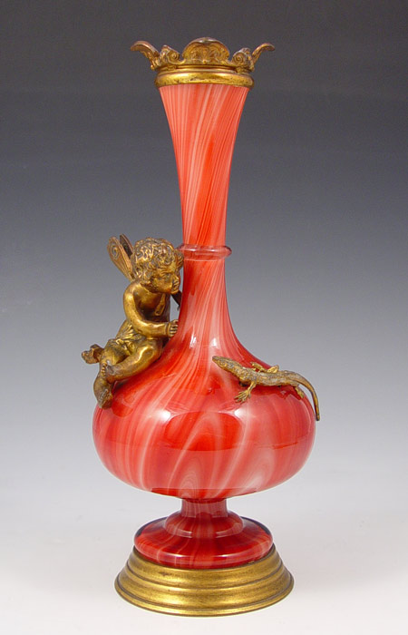 19TH C LOETZ KARNEOL MARMORIERTE CHERUB AND LIZARD MOUNTED ART GLASS VASE: Red marbleized glass cased in white. Gilt metal cherub, lizard, rim and weighted base. 10 1/2''h.