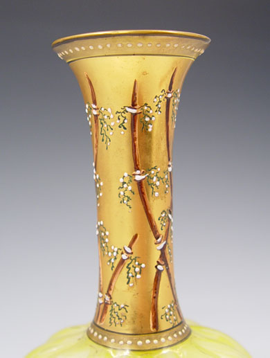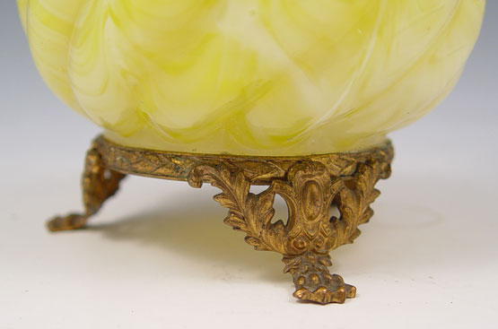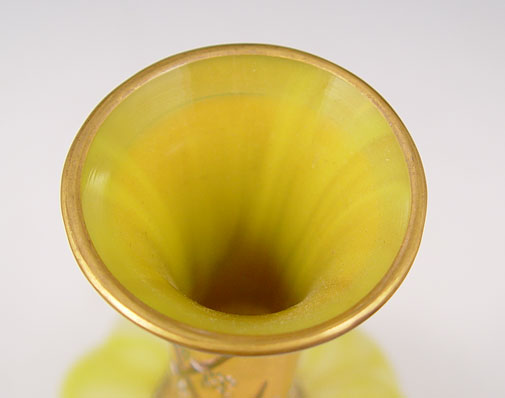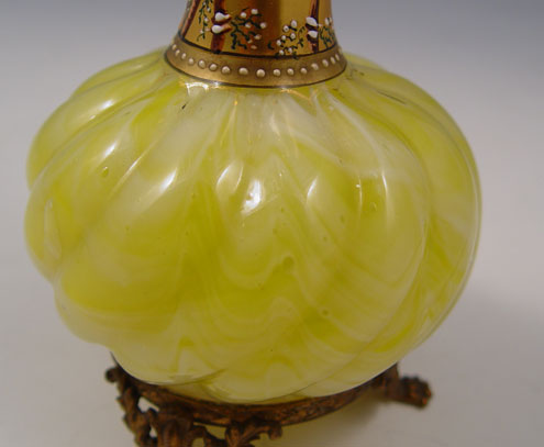 LOETZ MARMORIERTE ART GLASS VASE: Swirl body with neck overlaid in enameled gold. Mounted on a filigree metal base. 7'' tall. Glows orange under a black light.