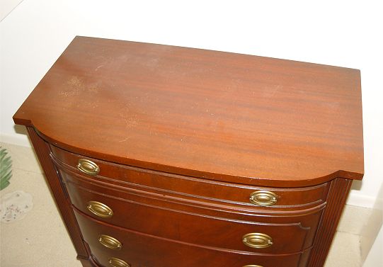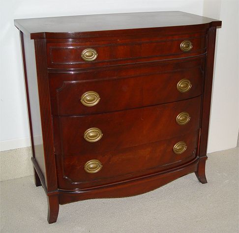1920'S MAHOGANY BOWFRONT CHEST: Upper flatware drawer over 3 drawers. Measures 34'' h. x 34'' wide x 17 3/4''.