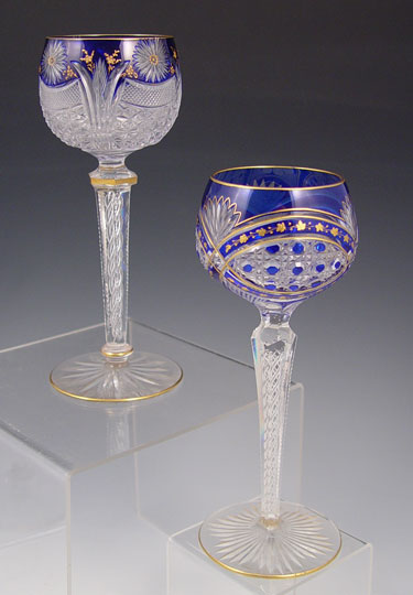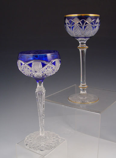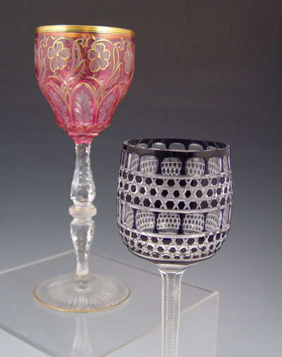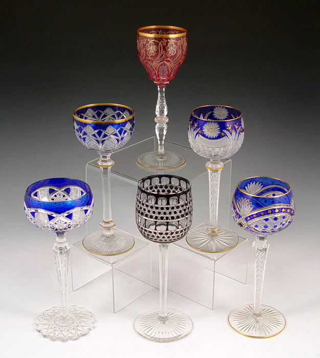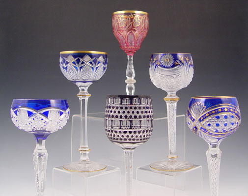 COLLECTION OF 6 BOHEMIAN CUT GLASS GOBLETS: Assortment of color and design, to include cobalt, cranberry and ruby. Largest measures 7 1/4'' high.