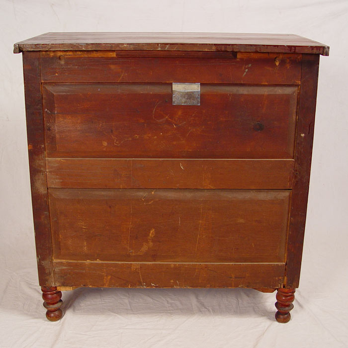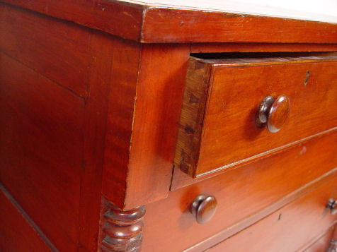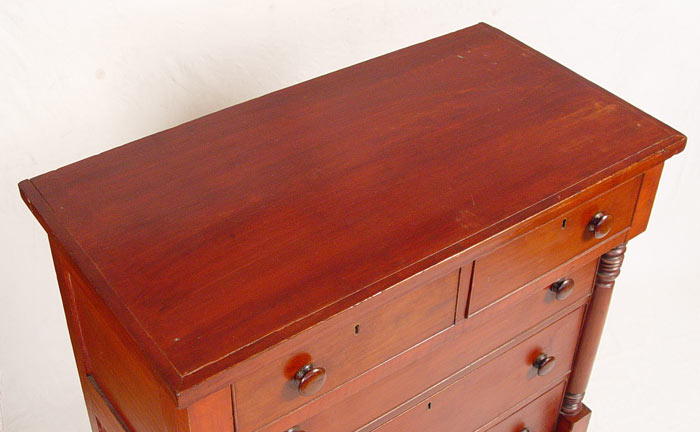 19th C SHERATON / EMPIRE CHEST OF DRAWERS: Block and half column stiles. 2 drawers over 3 drawers, red mahogany finish, paneled back and sides. 44'' tall x 42 1/2'' wide x 22'' deep.