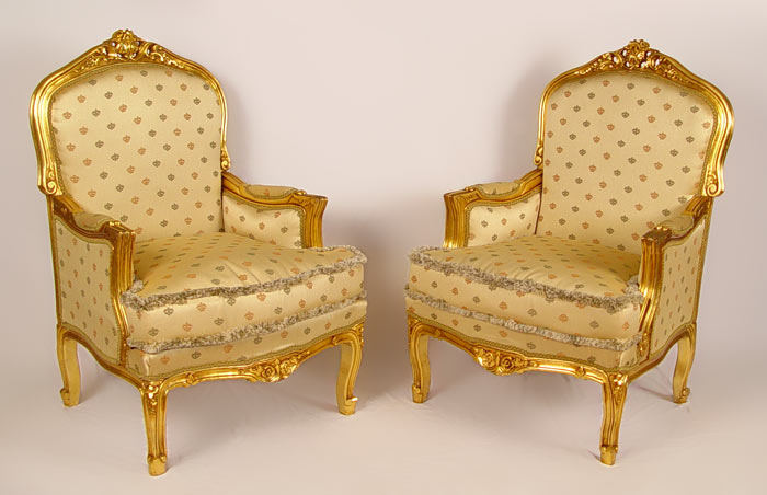 PAIR GRAND FRENCH STYLE CARVED AND GILT WOOD ARM CHAIRS: Upholstered arm chairs, overall nice condition. Measure 43 3/4'' high x 30'' x 32''. Note a matched pair of chairs and sofa at the following two lots 97 and 98.