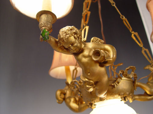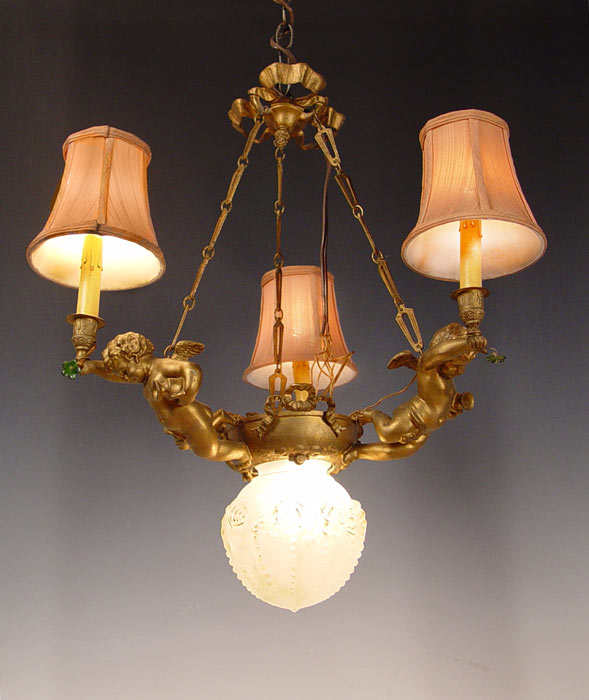 PETITE FRENCH FIGURAL CHANDELIER: Three lights supported by putti figures, 1 light under glass shade. Approx. 27''h. x 25'' dia.