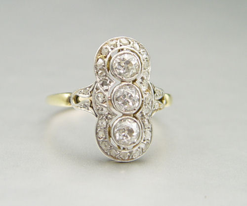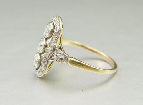 ANTIQUE 3 STONE DIAMOND RING: 14K yellow gold ring with platinum top contains three old mine cut diamonds and twenty-eight rose cut diamonds. Weight: .65 Ct. Approx. The old Europeans average VS in clarity and H-I in color. The diamonds are bezel and bead set. Weight: 2.9 grams. Size: 8 Circa: 1885-1900