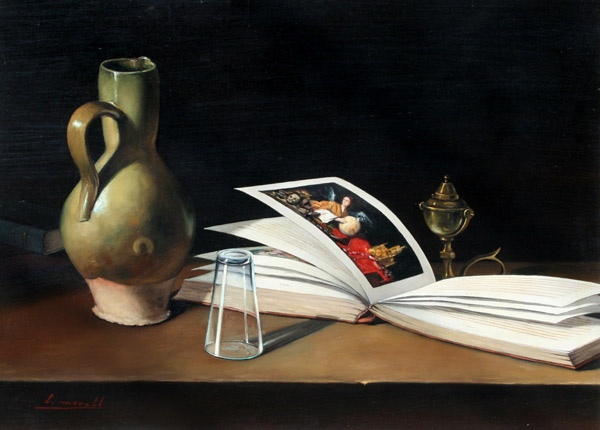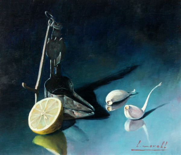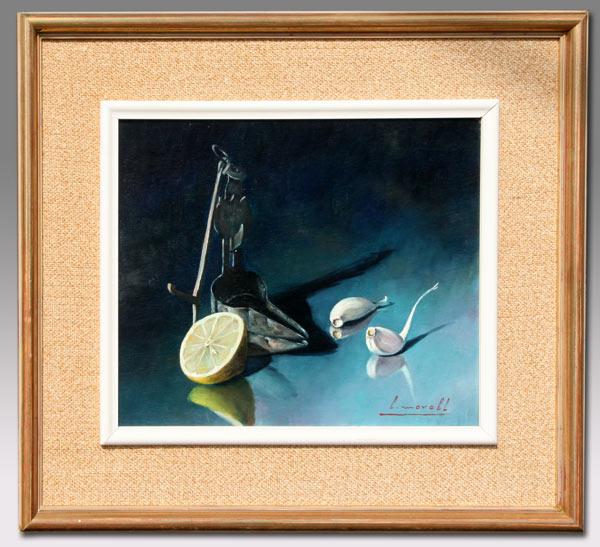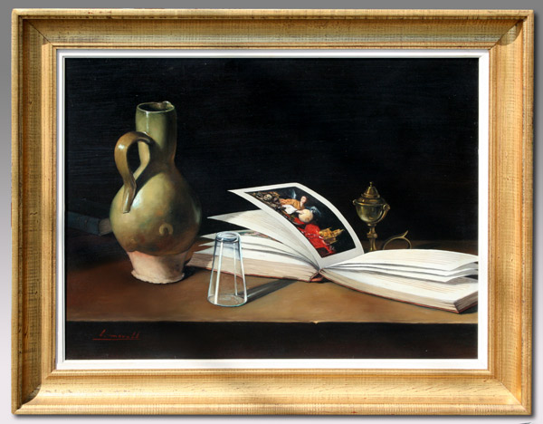 MORELL, Luis, (Spanish, 1911-1985): 2 piece still life lot; Pottery Ewer, Shot Glass and Art Reference Book, Oil/Canvas, 24'' x 32'', signed, framed, 32'' x 39''; Whale Oil Lamp, Lime and Garlic, oil/Canvas Board, 10 1/2'' x 13'', framed, 17 1/2'' x 20''.