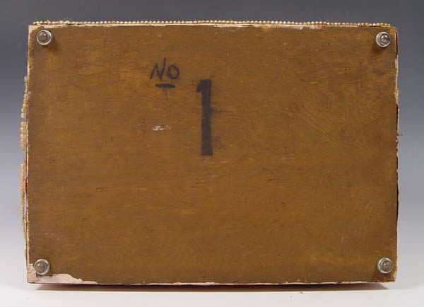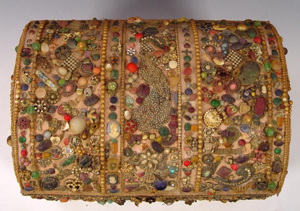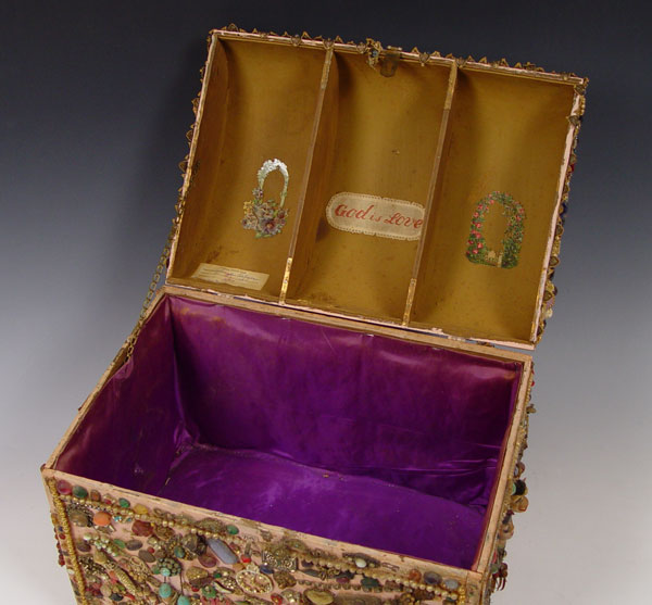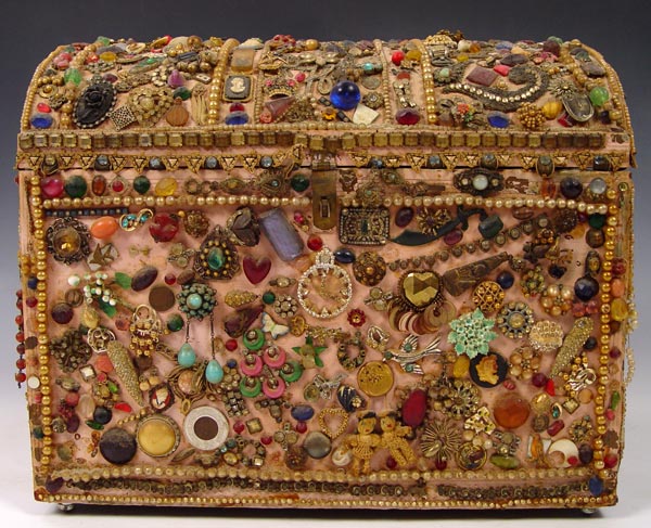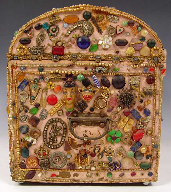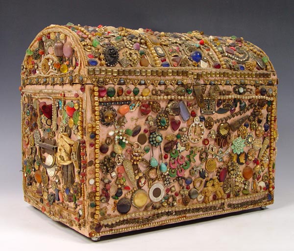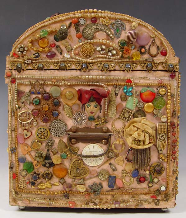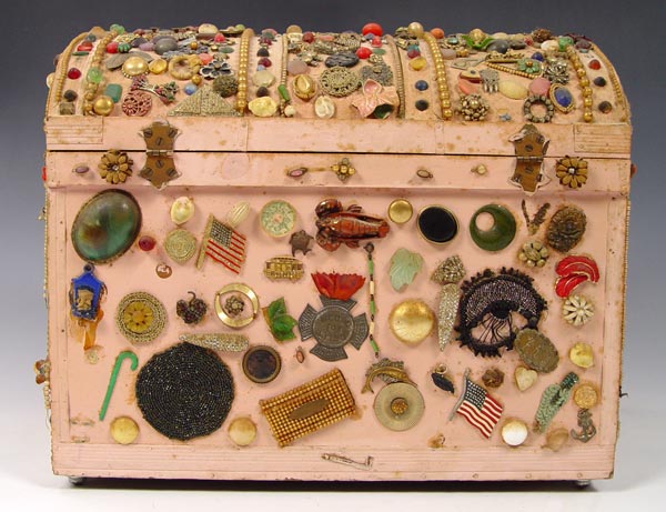 FOLK ART MEMORY TRUNK: With the undated Tulsa State Fair exhibition label. Painted wood trunk covered in mostly jewelry parts and trinkets. Satin lined. There is some loss. The trunk is 15'' tall x 18'' x 13''.