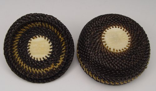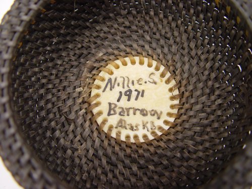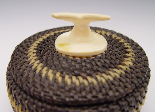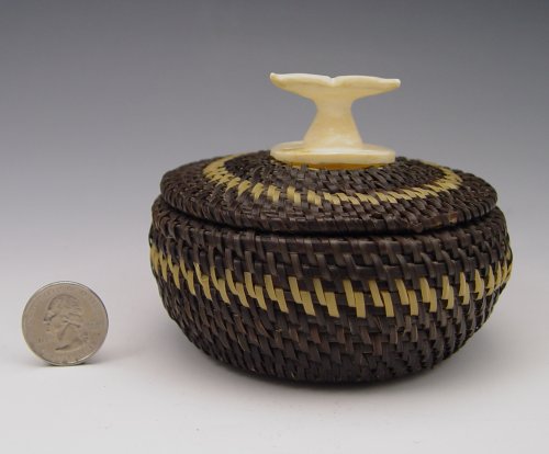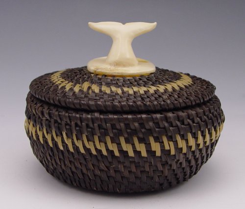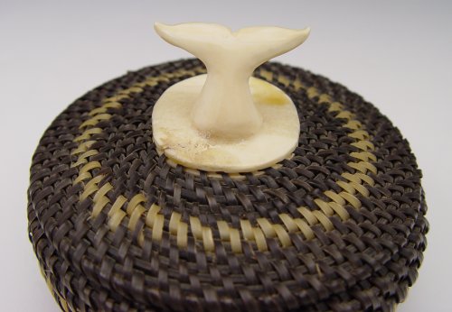 SIGNED ALASKAN BALEEN BASKET WITH IVORY WHALE TAIL: Signed inside Nillie. S. 1971 Barrow Alaska, on ivory disk. Measures 3 1/4'' h. x 4 1/8''