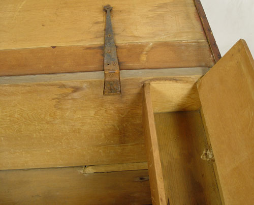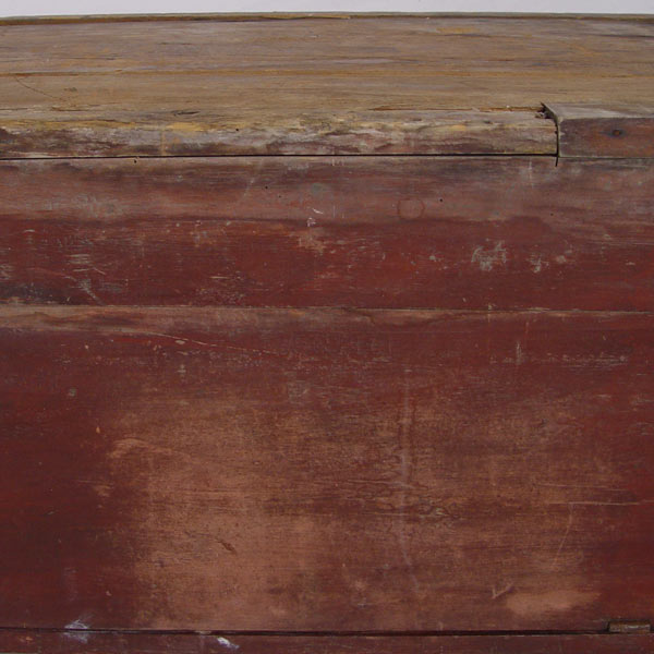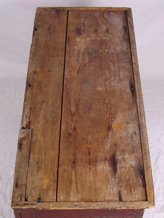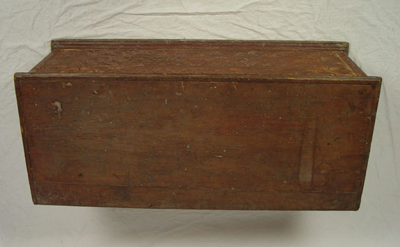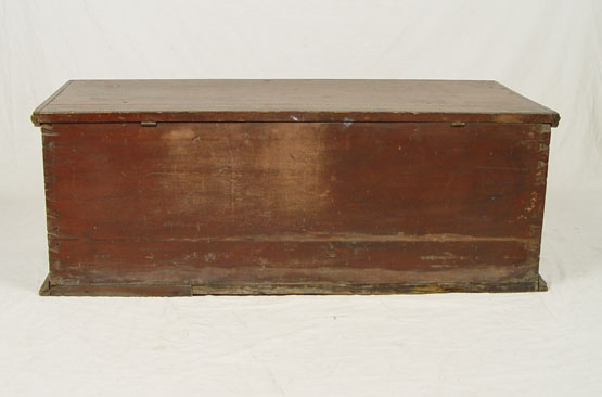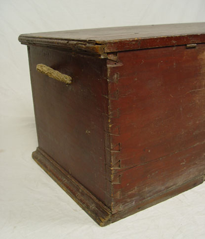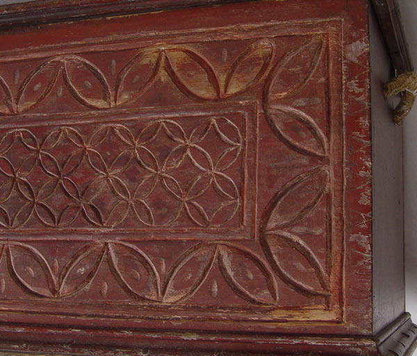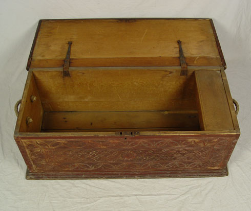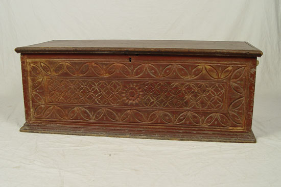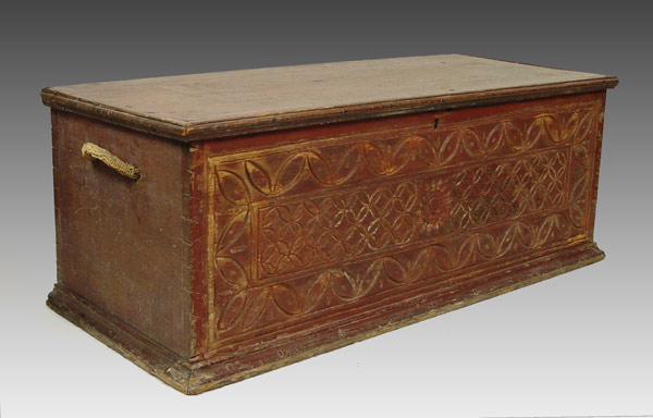 CARVED SEAMAN'S CHEST: The front carved in a Dutch design, original red paint, rope bail handles. The interior with till and iron strap hinges. Dovetail construction, molded base. 18 1/2'' tall x 49 1/2'' x 21''.