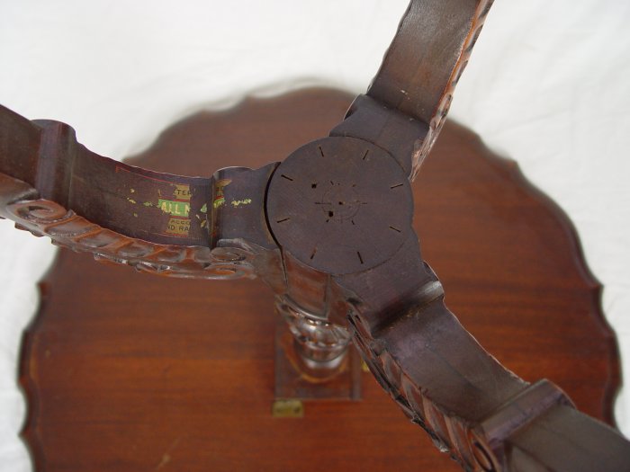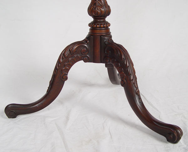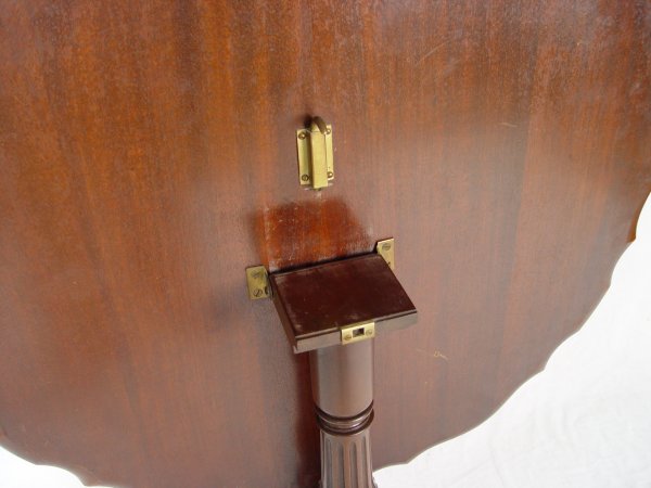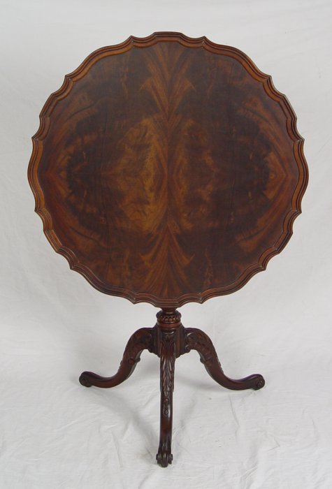 MAHOGANY PIE CRUST TILT TOP TEA TABLE: Butterfly veneered top, carved and fluted central column, trio of legs. 29'' tall x 30'' dia.