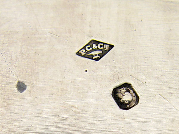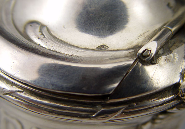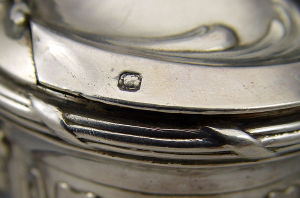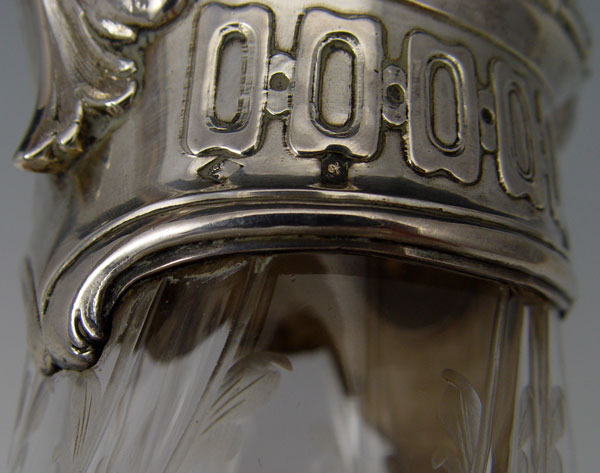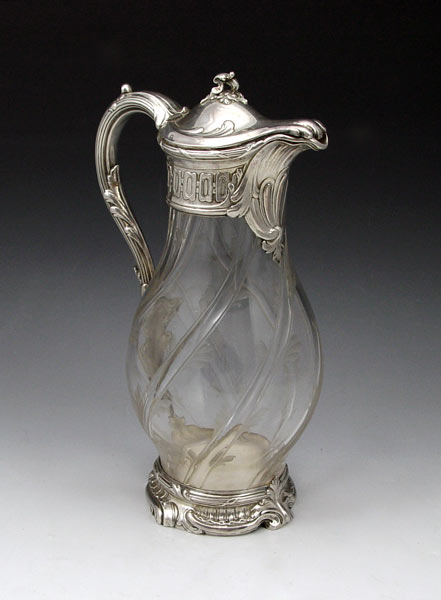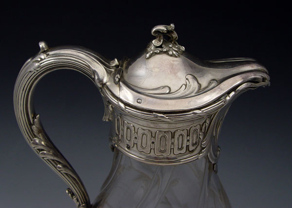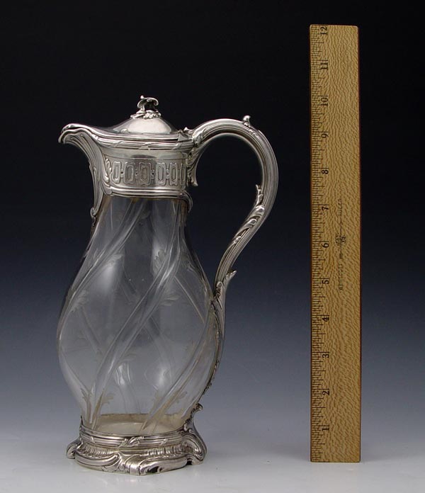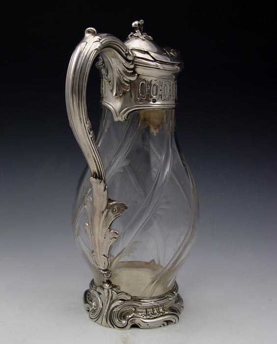PAUL CANAUX FRENCH SILVER OVERLAY CLARET JUG: Turn of the century 950 silver overlay claret jug by Paul Canaux et Cie. Embossed floral and geometric design silver over cut and etched glass body. Measures 10'' h. x 5 3/4''.