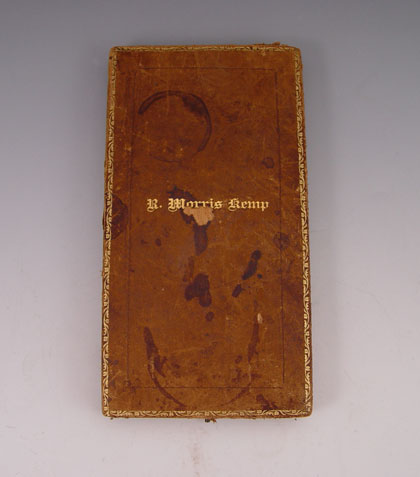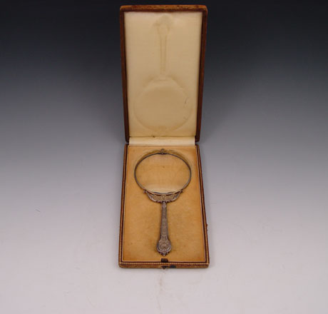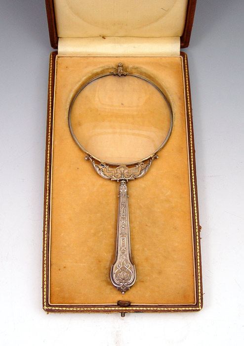 FRENCH STERLING MAGNIFYING GLASS IN PRESENTATION CASE: Embossed handle and mount. Unidentified French makers hallmark on bezel. 7 3/8'' long. In cloth lined, leather covered, presentation case with owners name on front. Case 8 1/2'' x 4 1/2'' x 1''.