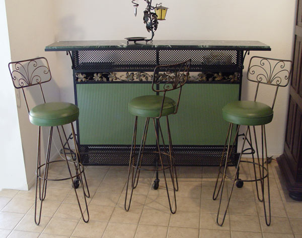 HAND MADE WROUGHT IRON BAR WITH MARBLE TOP & 3 STOOLS: Made in Greece. Bar on large wheels for easy movement. Measures 45'' h. x 63 1/2'' x 21''. Stools 42 1/4'' h x 19'' base dia.