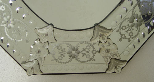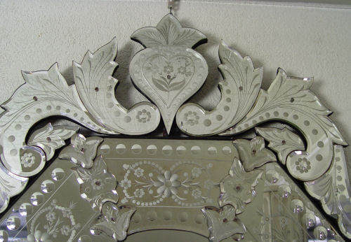 VENETIAN ETCHED GLASS MIRROR: Etched and cut glass mirror, the center oval being beveled. Constructed of approx. 41 pieces of individual mirror pieces. Wood back. Minor foxing to the glass. 48'' h. x 29 1/2''