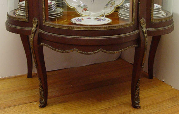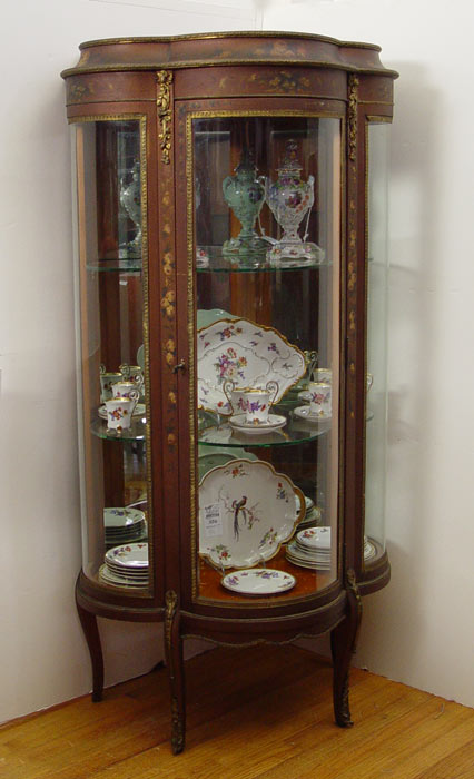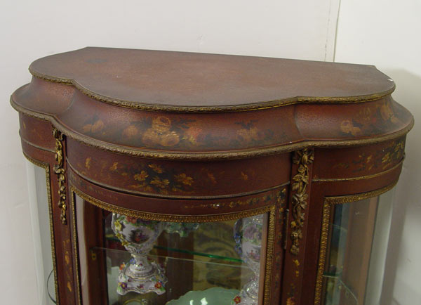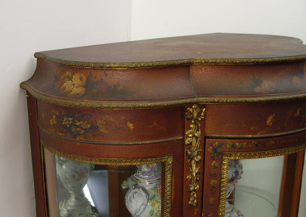 FRENCH VITRINE DISPLAY CABINET: Original floral paint decoration under an alligatored finish, Triple bowed front and sides. Mirror back interior with 2 glass shelves. 55 1/4'' h x 28'' x 17 1/2''.