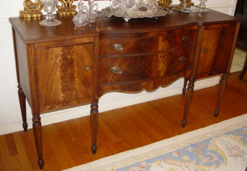 SHERATON STYLE MAHOGANY SIDEBOARD: Swell front with drawers flanked by richly grained doors. 36 3/4'' h x 66'' x 20 3/4''.