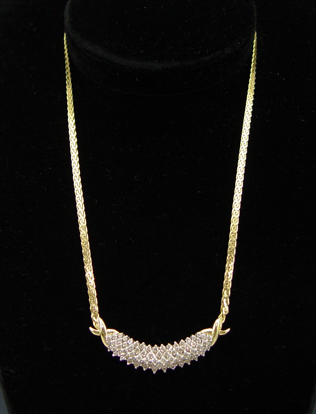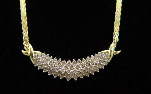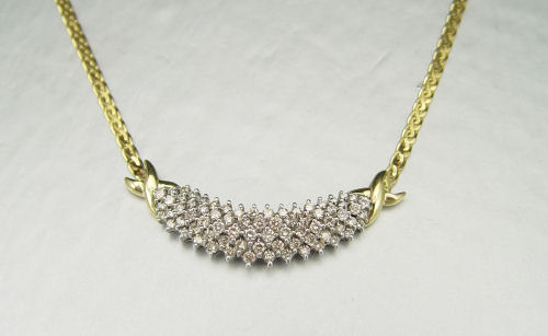 DIAMOND NECKLACE: 14K yellow gold necklace contains seventy five round full cut diamonds. Weight: 2.00 Ct. Approx. The diamonds average SI in clarity and Top Light Brown in color. The diamonds are prong set. Weight: 15.1 grams. Fancy link chain. 18''