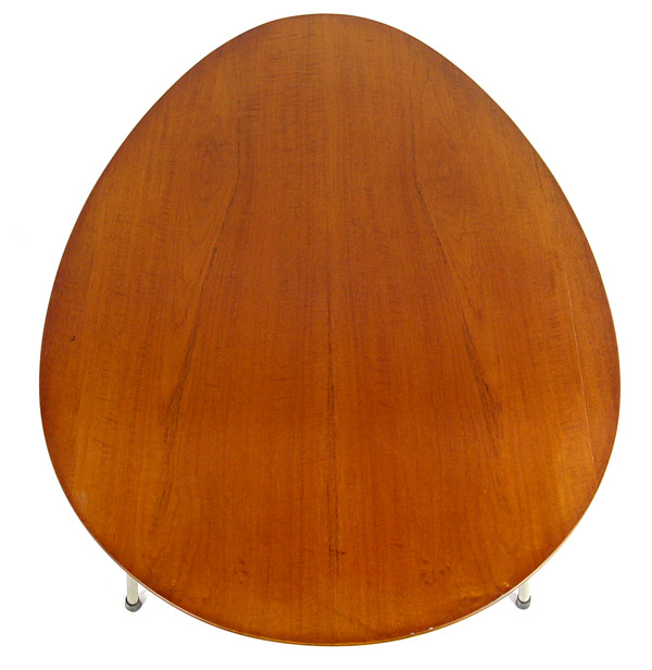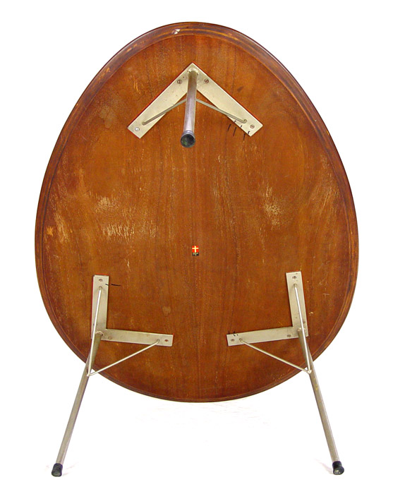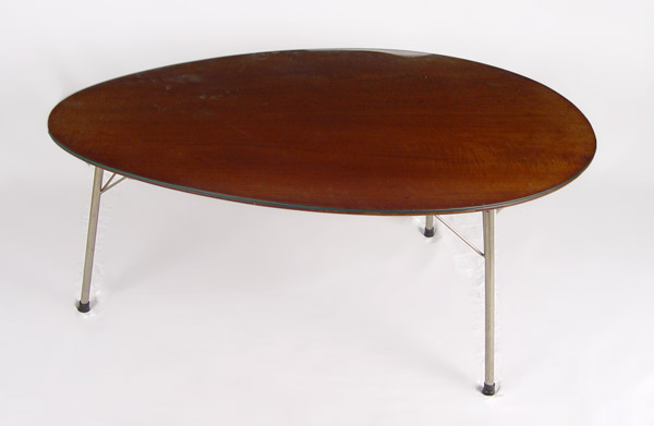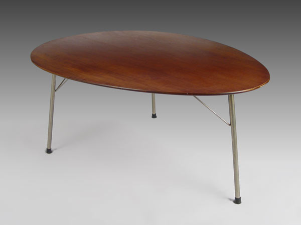 ARNE JACOBSEN FOR FRITZ HANSEN EGG TABLE: The infamous Egg form tabletop on metal legs. The top has been protected with glass. 19'' tall x 45'' x 32 3/4''. Bears the Fritz Hansen label.