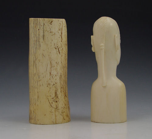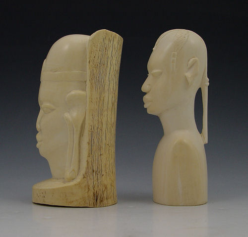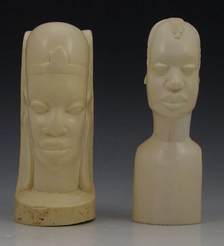 2 PIECE AFRICAN CARVED IVORY FIGURES: To include 1) Bust of man with ponytail hair. Note split on top of head, chips on ears. 5 1/2'' h. 2) Bust of a woman with elongated ears. Note fill in top. 5 1/4'' h.