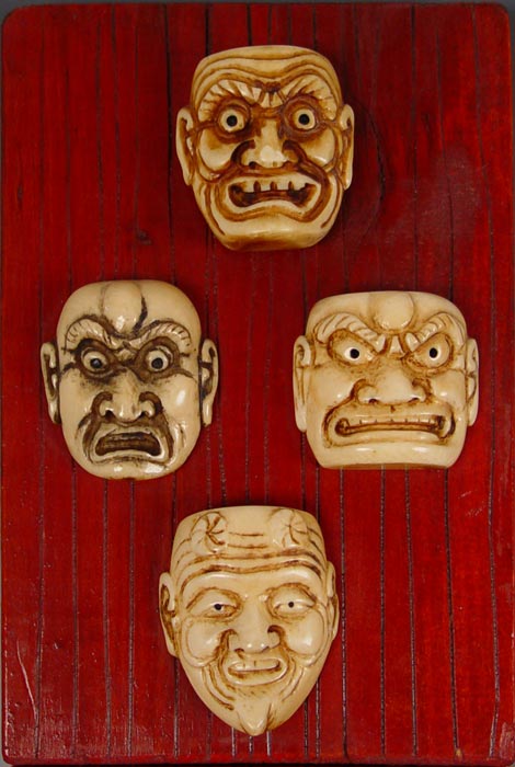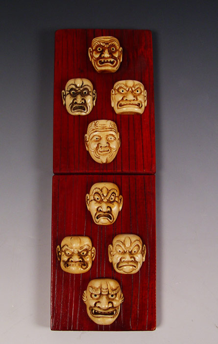 8 CARVED IVORY MASKS: Each approx. 2 - 2.5'' length. 1 1/4'' deep. Mounted on 2 red stained boards, 8 1/'' x 5 1/2''.