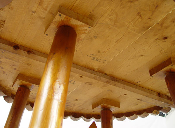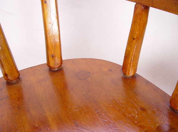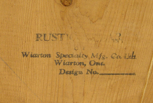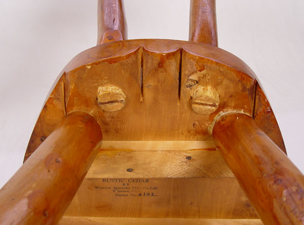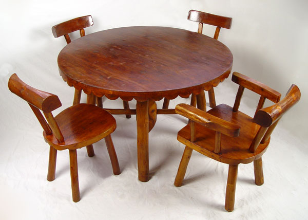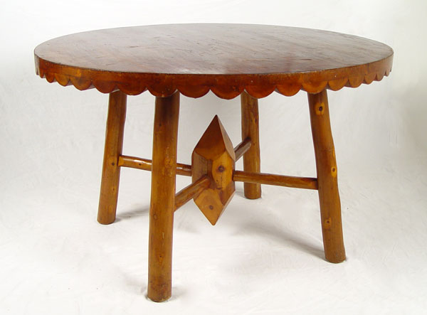 RUSTIC CEDAR TABLE & 4 CHAIRS: By Wiarton Specialty Mfg. Co., Ontario. Debarked and varnished handmade quality. Round table with splayed legs stretcher base and scalloped apron. One arm chair, 3 side chairs. Table 30'' h x 48'' dia. Arm chair 30 1/2'' high x 24 1/2'' x 22''.