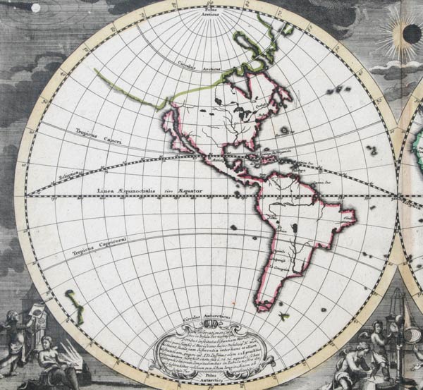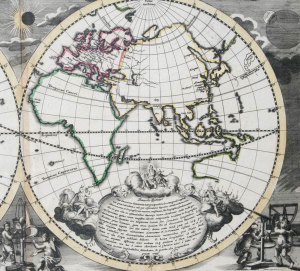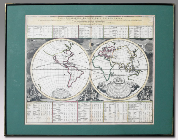 DOPPELMAYR, Johanne Gabriel (1677-1750): Circa 1742, Basis Geographiae Recentioris Astronomica world map, hand tinted. Maps shows California as a island, and has listing of latitude, longitude an eclipse chart of major cities. Framed and matted, sight size 19 1/2'' x 23'', framed 23 3/4'' x 30 1/4''.
