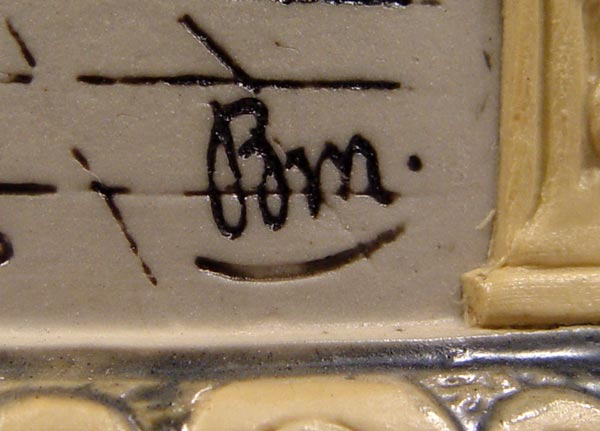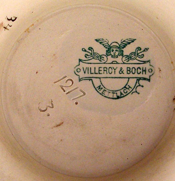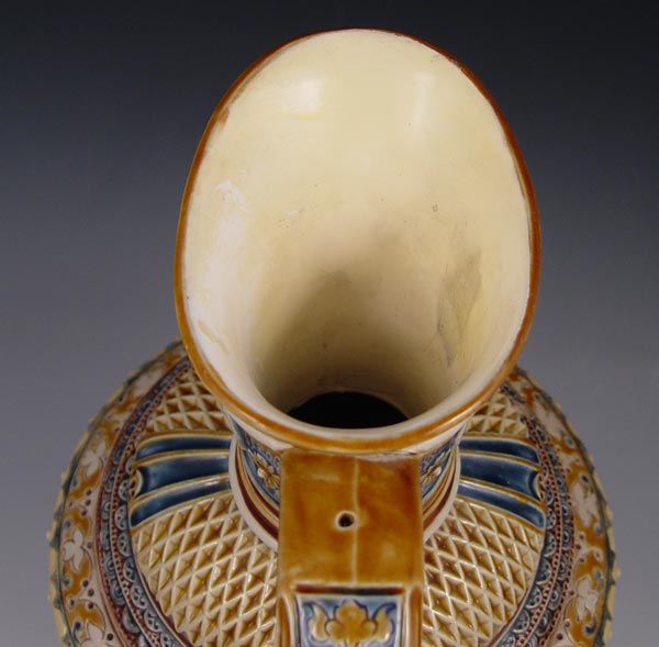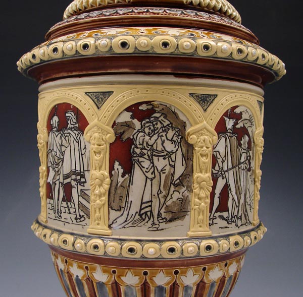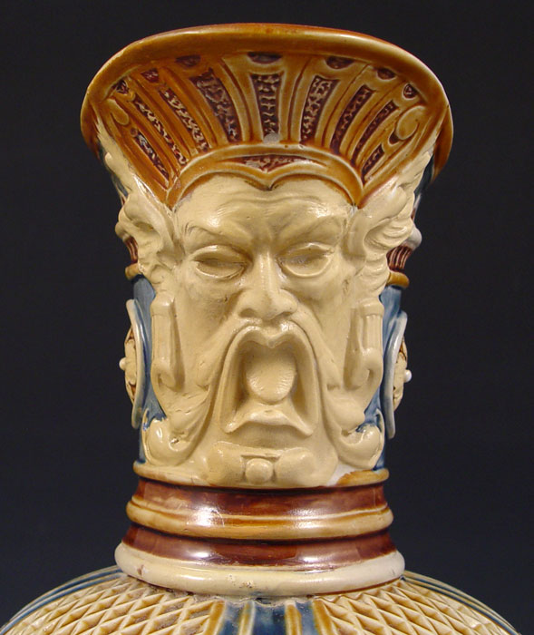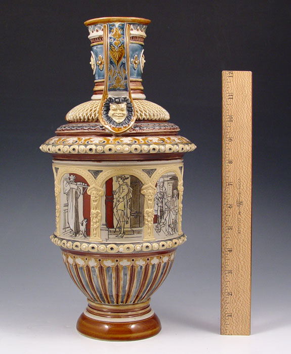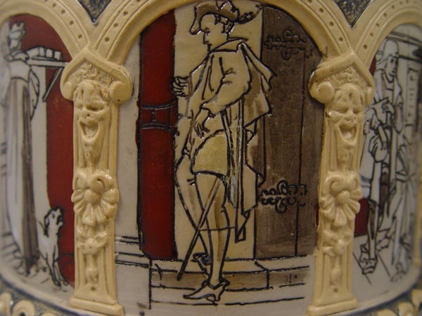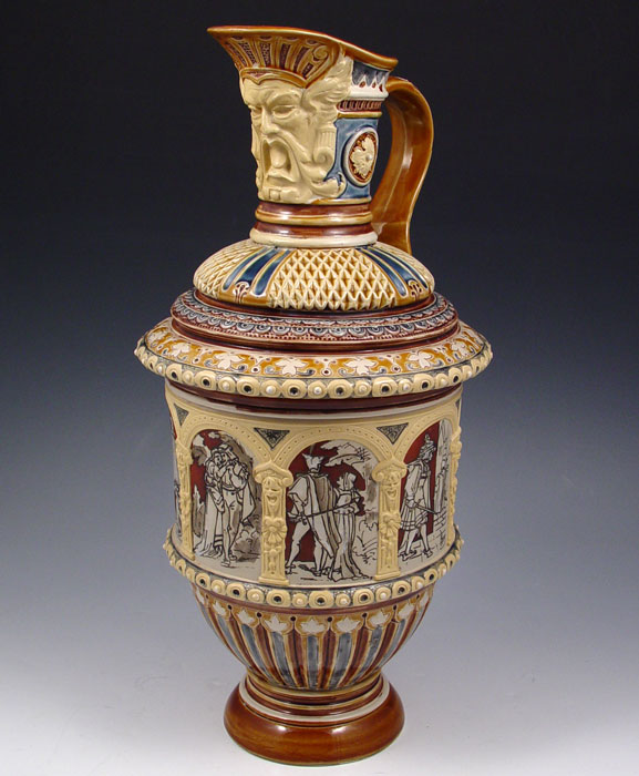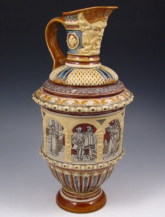 VILLEROY & BOCH METTLACH PITCHER #1217: Etched with Faust opera scenes and masqueron under lip/ Measures 14 3/4'' h. x 7 1/2'' dia.