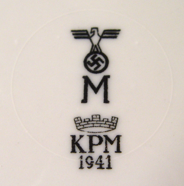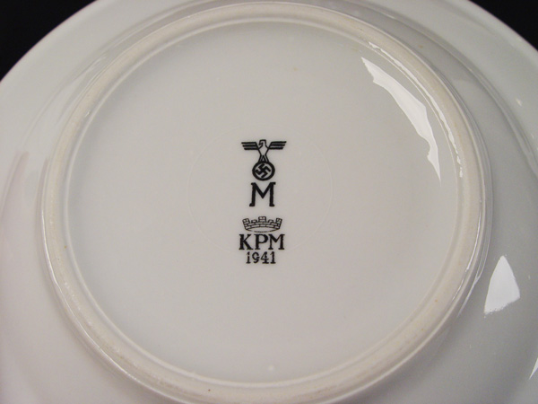 GERMAN WWII KREIGSMARINE KPM CHINA: WWII German Navy dishware. 19 pieces to include large serving bowl, 10 low soup bowls (9 1/2'' dia.), 6 plates (9 3/4''), covered sugar and cream pitcher. Underside marked KPM and bears the German insignia, letter M, and 41.