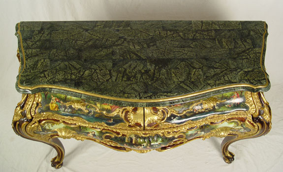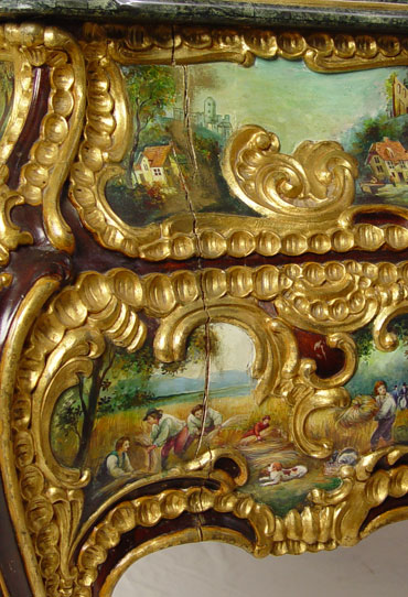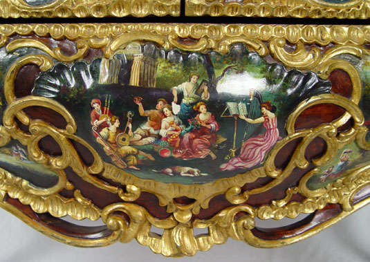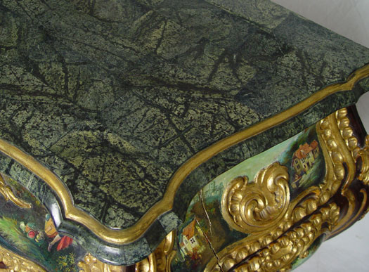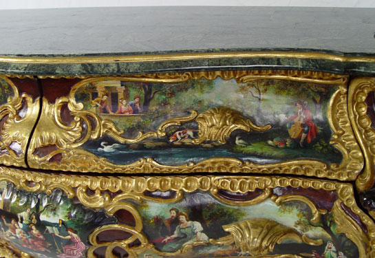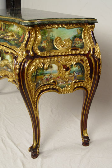 PROFUSELY CARVED AND PAINT DECORATED MARBLE TOP COMMODE: Green marble top with over the top painted and gilt decoration. Mid to later 20th C. 35 1/4'' h x 56'' x 19 1/2''